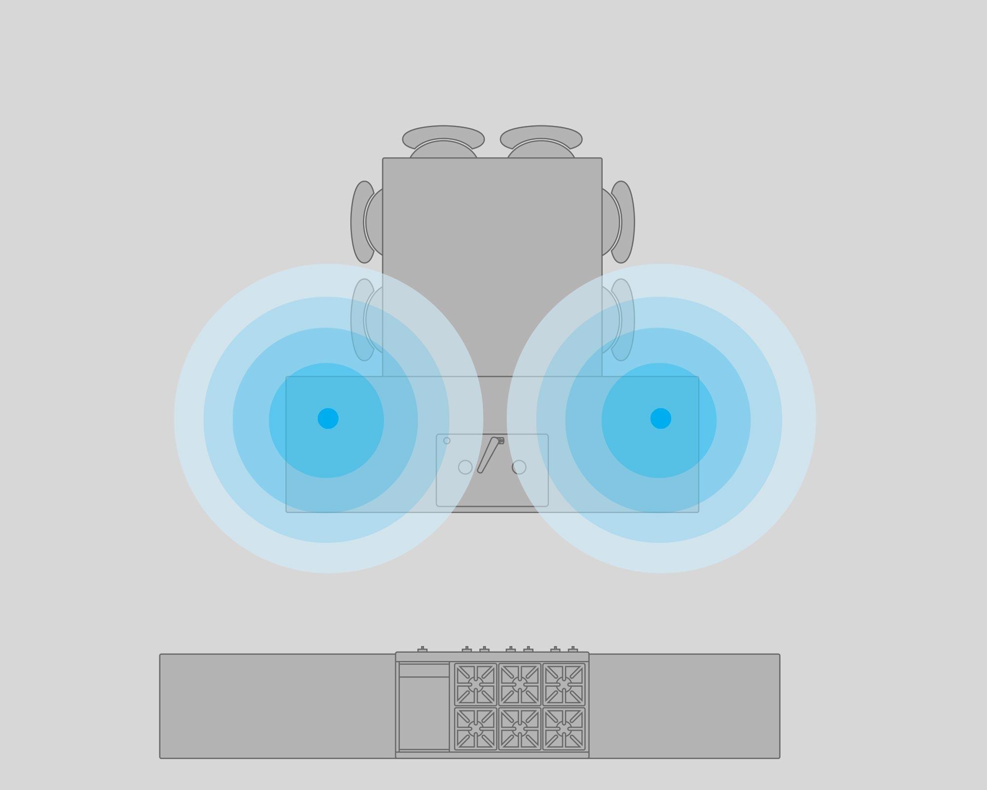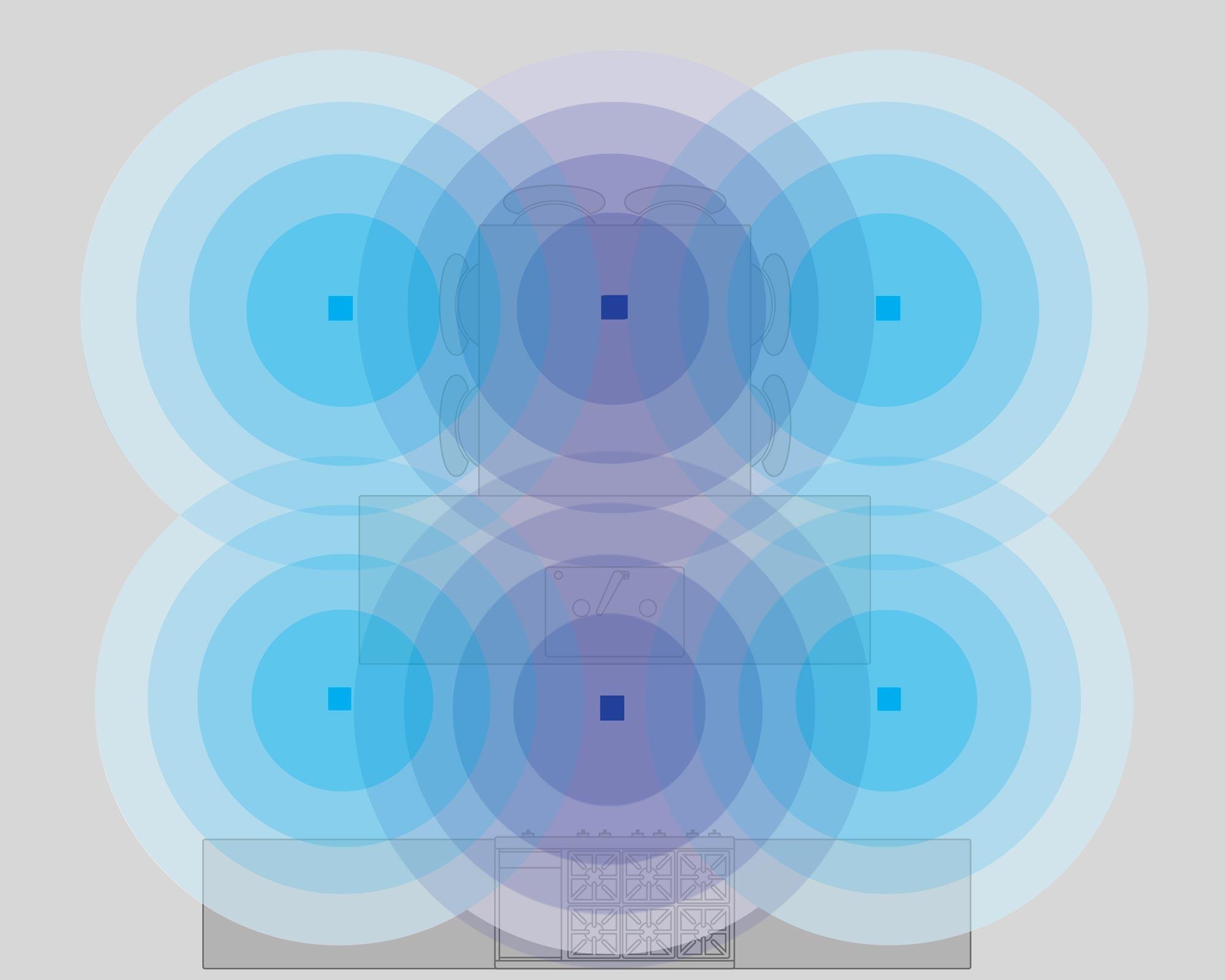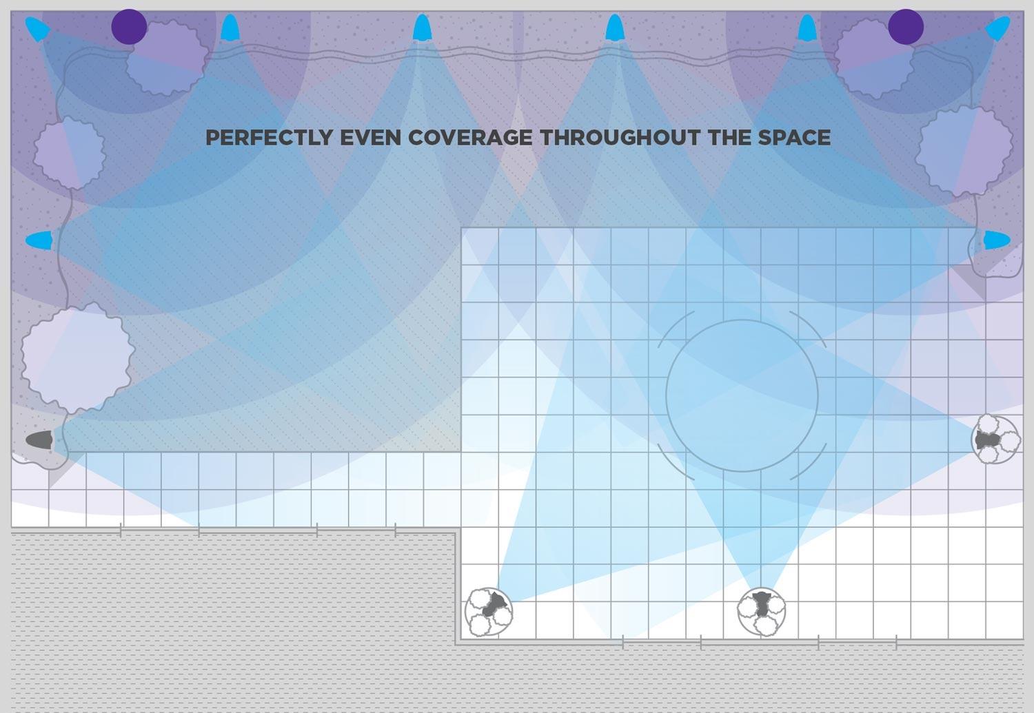 When designing an audio experience indoors, it is critical to provide even, balanced coverage to create an immersive environment. This balanced approach can be applied much like overhead lighting. An even dispersion of lighting can be achieved by placing multiple lights, spaced evenly throughout a room.